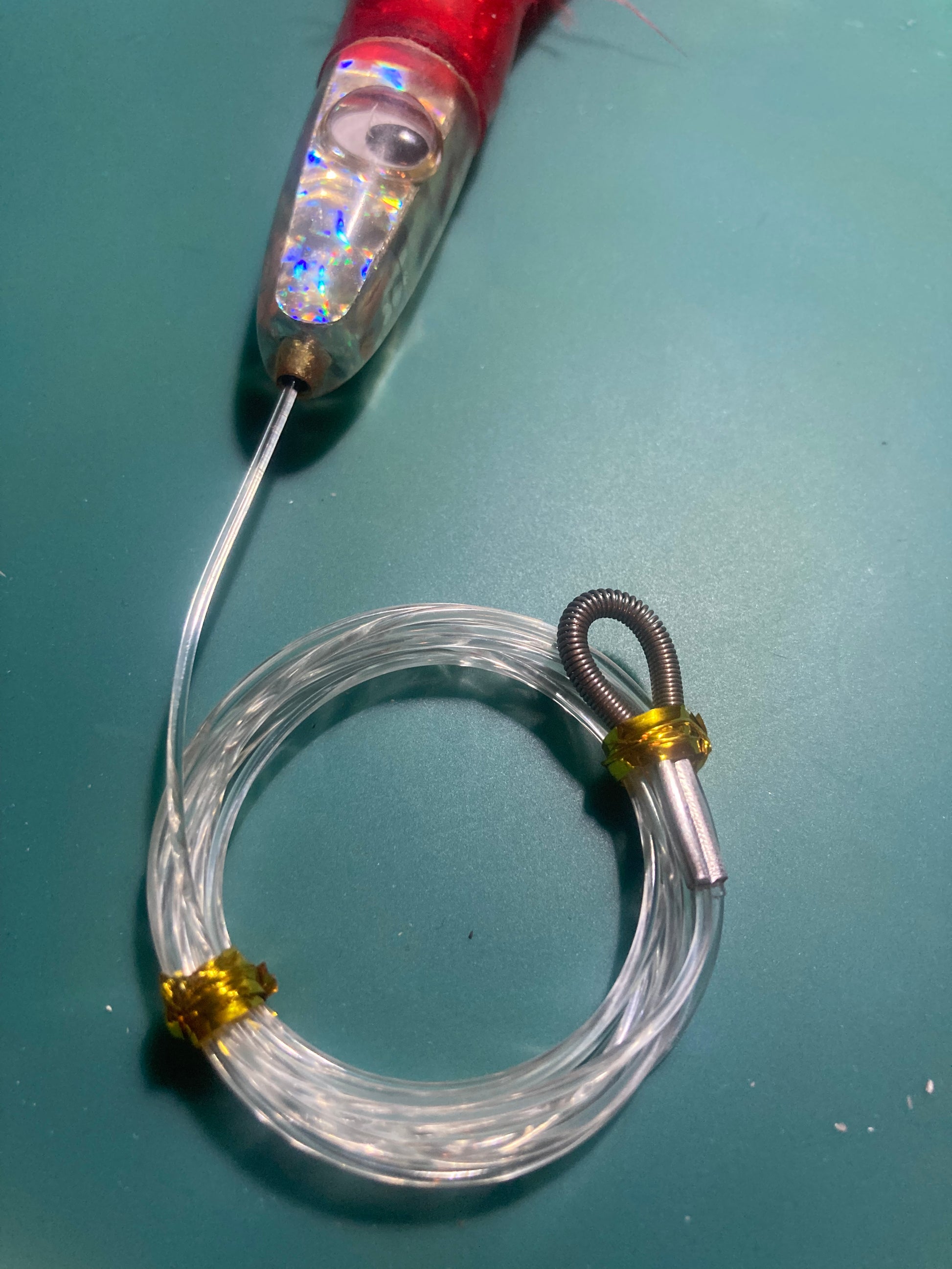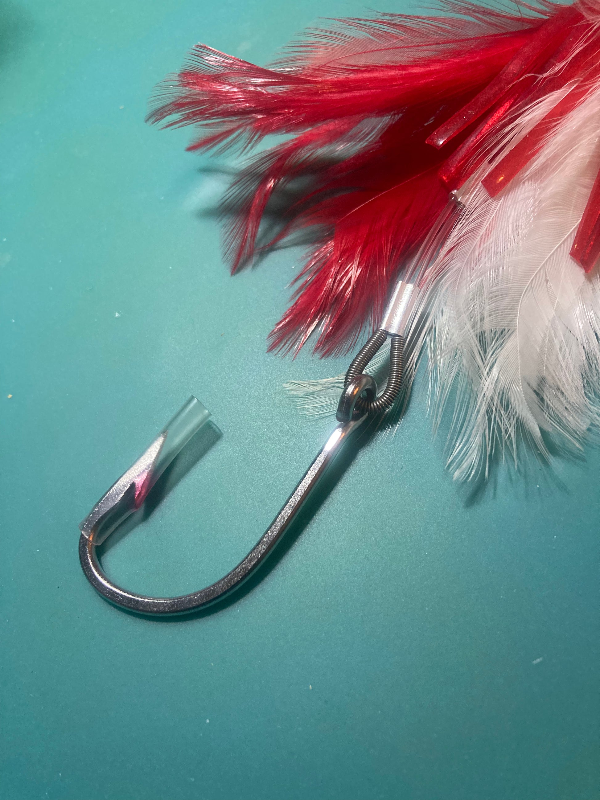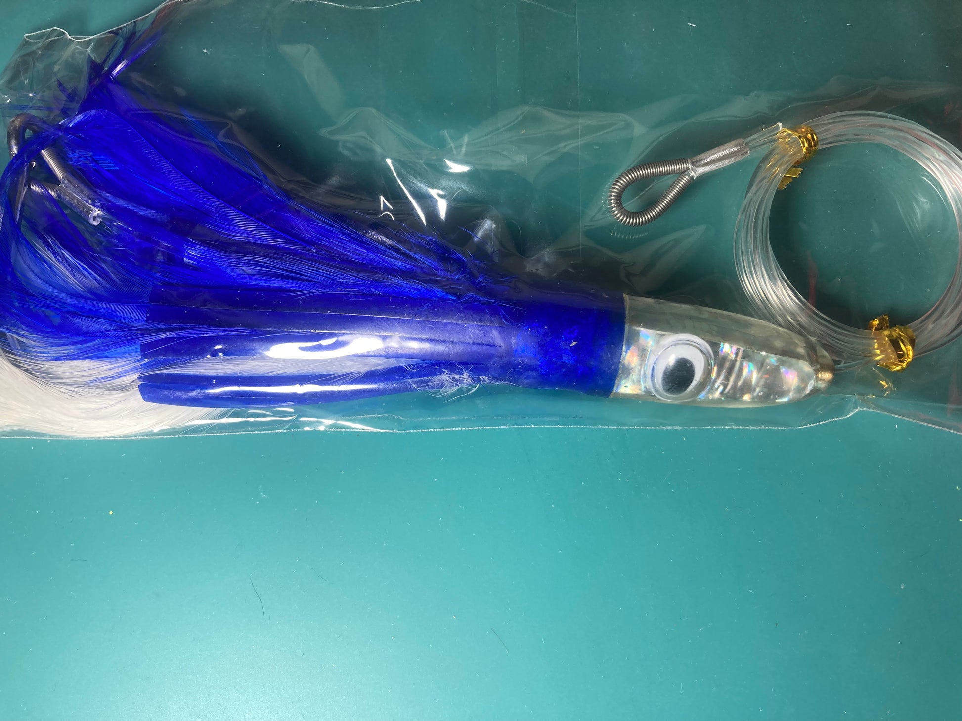 Troll on surface or subsurface to approx. 5' depending on speeds of 3-8 mph. Can be trolled at any preferred depth using weighted downriggers. Absolutely great combo of rubberized squid look with the beautiful fish attracting action of feathers creates a presentation in the water that these big game fish just cannot say no to.