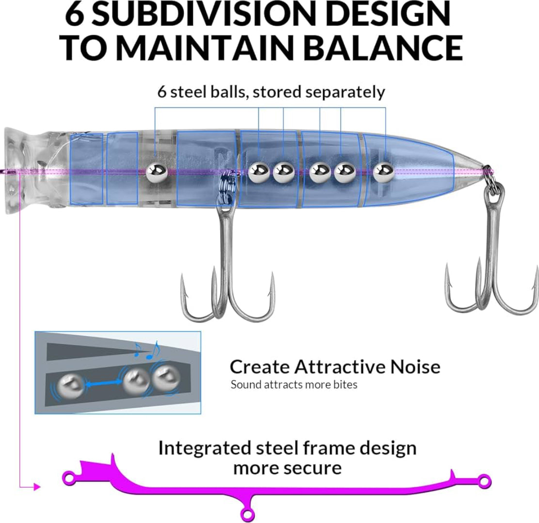 Long-Distance Casting Design: The center of gravity of the steel ball in the lure facilitates stable and smooth aerial postures during casting, enabling long-distance casts with ease. The steel ball produces sound and the largemouth design creates splashes upon retrieval, attracting fish with both visual and auditory stimuli.